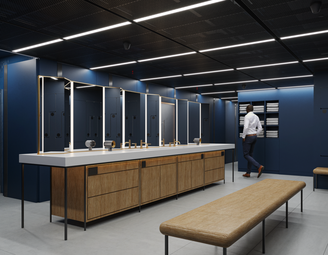 Communal wellness and fitness studio with 18 showers, 225 lockers and a towel service